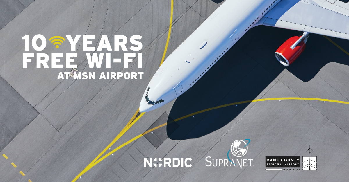 Madison, Wis. – SupraNet Communications, Inc., a local leader in high-speed fiber and Wi-Fi internet services, and Nordic Consulting, a global health and technology consulting company based in Madison, are extending their partnership to offer unlimited free Wi-Fi services at Dane County Regional Airport (MSN) – making it the 10th year of free Wi-Fi for travelers.
